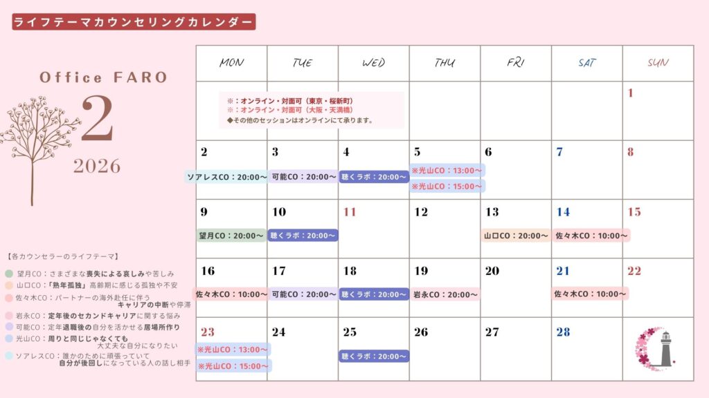 2026年2月のライフテーマカウンセリングの予定です。